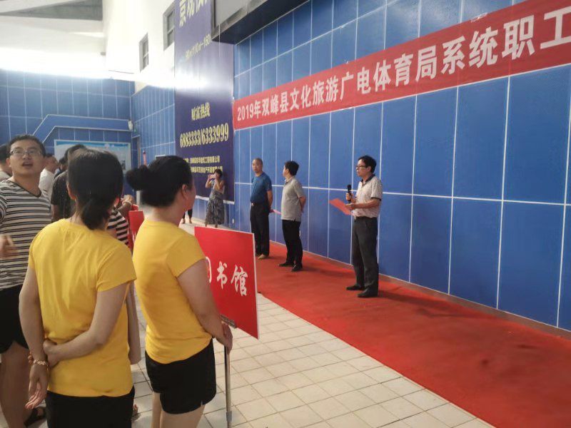 为庆祝中华人民共和国成立70周年,为丰富我馆干部职工的业余文化体育生活,追求健康的文明新风尚,提高干部职工的身体素质。2019年9月5号我馆参加了双峰县文化旅游广电体育局系统职工游泳比赛。比赛共设置男、女50米游泳、潜水憋气、4×20米接力赛。